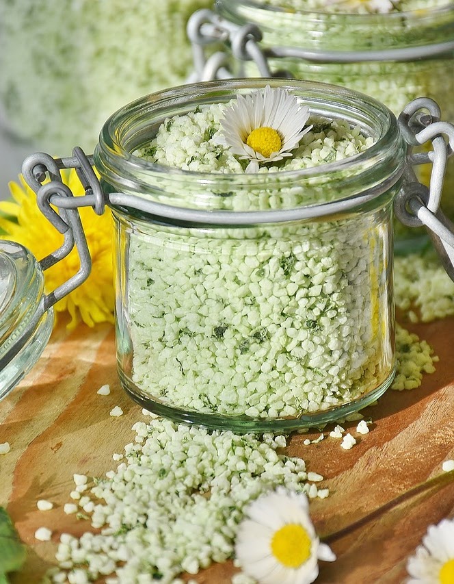 - Frische Lieblingskräuter oder essbare Blüten (gleiche Menge wie Salz) waschen, trocken tupfen oder in einer Salatschleuder trocken schleudern (Blüten nicht waschen)